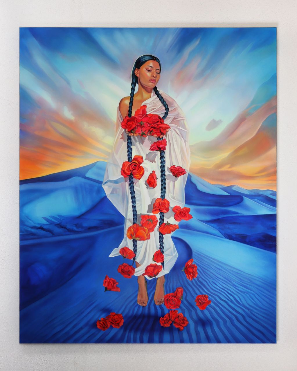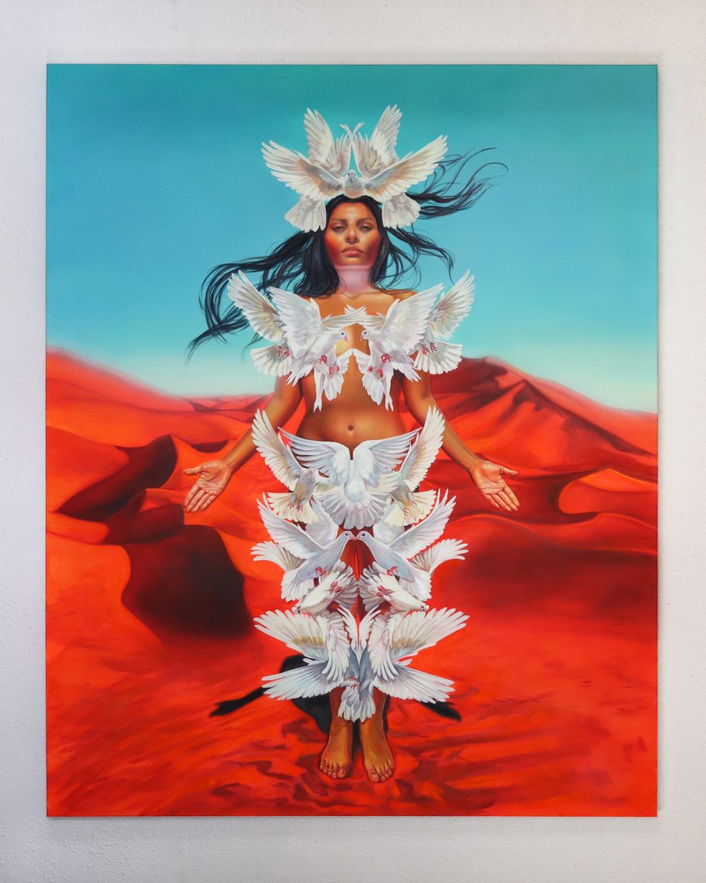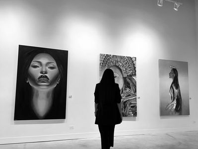 Blending oil painting and airbrush techniques, I engage with a duality: oil connects my practice to classical traditions and the legacy of religious indoctrination, while airbrush rooted in Y2K memorial portraiture offers a contemporary, community based language of remembrance. Together, these mediums form what I call Indigenous Surrealism: a visual language that conjures ethereal, dreamlike worlds, bridging ancestral memory with present-day narratives.